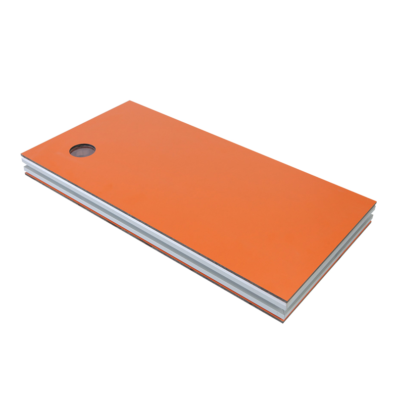 b. 芯材采用紙蜂窩,用熱固化膠在連續(xù)成型機(jī)內(nèi)熱加壓復(fù)合而成的超輕建筑板材;